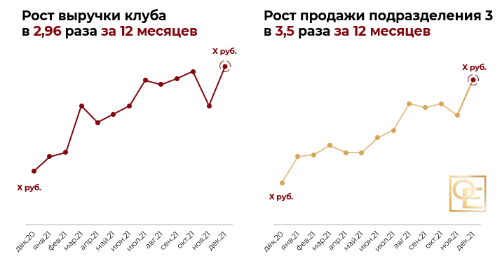 Далее мы внедрили еженедельные активности руководителя – формирование отчетности, планирование активностей на неделю по принципу управления отклонениями и приоритизацию активностей в зависимости от выполнения сотрудниками триггерных действий, влияющих на прибыль компании. Руководитель начал присоединяться к блокам и сотрудникам по следующему принципу – работа с новичками, далее – присоединение к работе сотрудников, в наибольшей степени невыполняющим план, наставничество. Появились стандарты проведения планерки руководителя, типовые повестки, обсуждение плановых показателей и причин отклонения клуба от запланированных цифр.